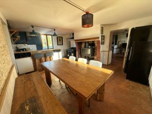 • d’une vaste pièce de vie avec cuisine ouverte et grande table à manger. Un salon avec des fauteuils, une table basse, une TV et deux canapés est aussi au rez-de-chaussée.