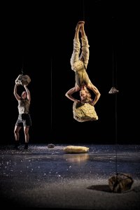 Sur scène, humains et pierres évoluent dans un équilibre en suspension, fragile, où tout peut chuter à n’importe quel moment.